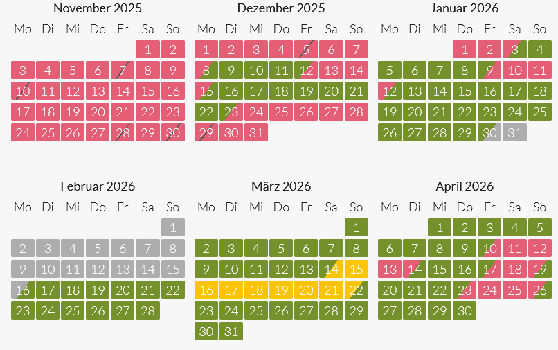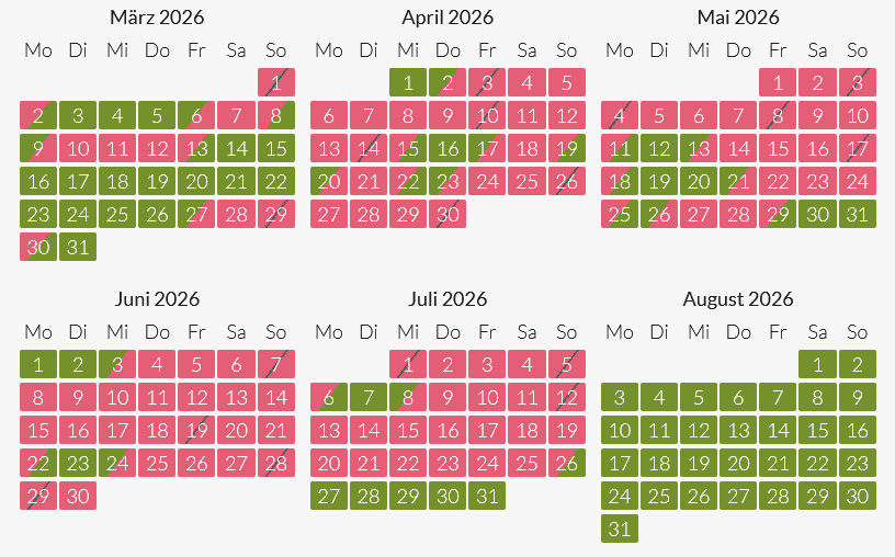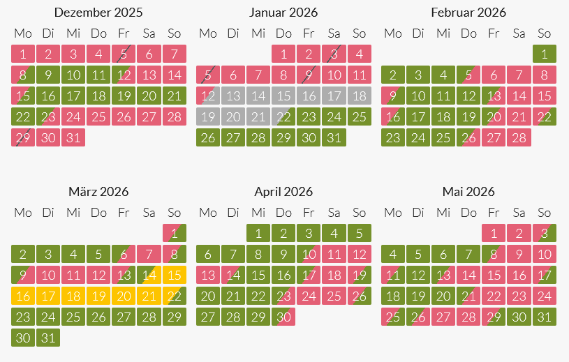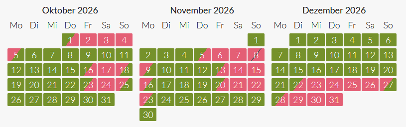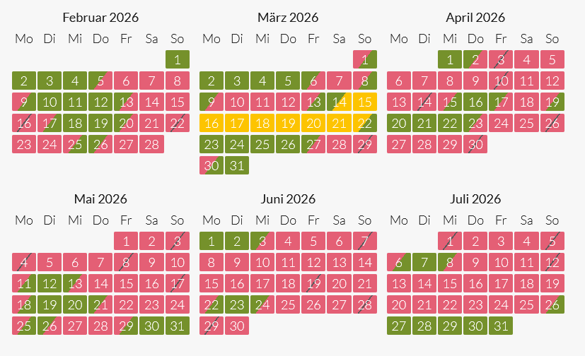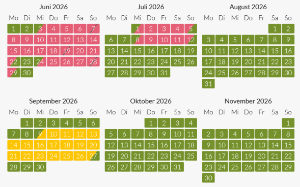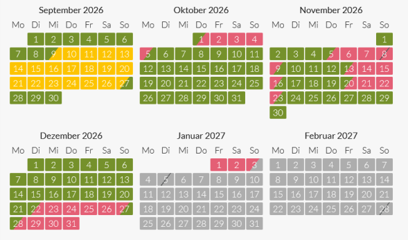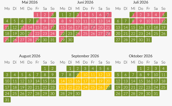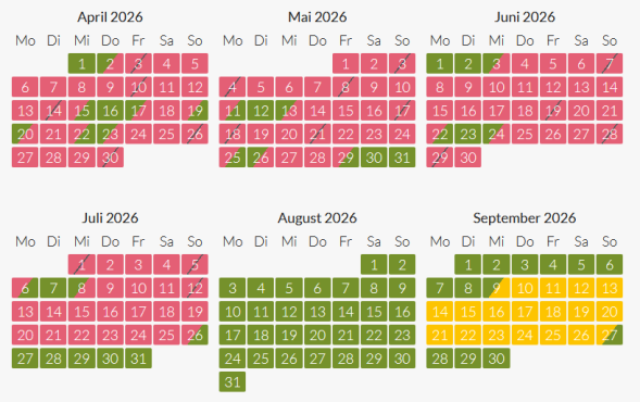 gelb = besonderer Mindestaufenthalt außerhalb der Hauptsaison erforderlich, auf Anfrage
